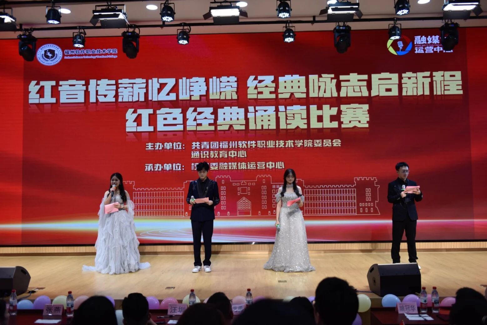 福州软件职业技术学院第十四届红色经典诵读比赛旨在传承和弘扬红色革命精神内核,营造爱国荣校的校园风尚。2025年12月3日18:30在教学楼图书馆8楼学术报告厅成功开展以“红音传薪忆峥嵘 经典咏志启新程”为主题的红色经典诵读大赛。出席本次比赛的领导嘉宾及评委有:校党委副书记林艺勇、学生工作部(处)部长汪圳、校团委书记王李沙、学生工作部(处)副部长陈佳莉、校团委副书记张玉梅、通识教育中心语文教研室主任张燕、各二级学院党总支副书记、分团委书记和通识教育中心语文教研室教师林俊兰。