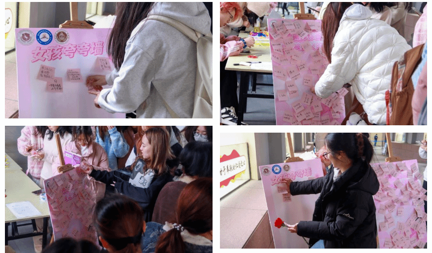 “撕标签”环节吸引众多师生驻足参与,大家亲手撕下对女性的刻板印象标签,并在“夸夸墙”上写下对女性的暖心祝福,传递对彼此的理解与敬意。