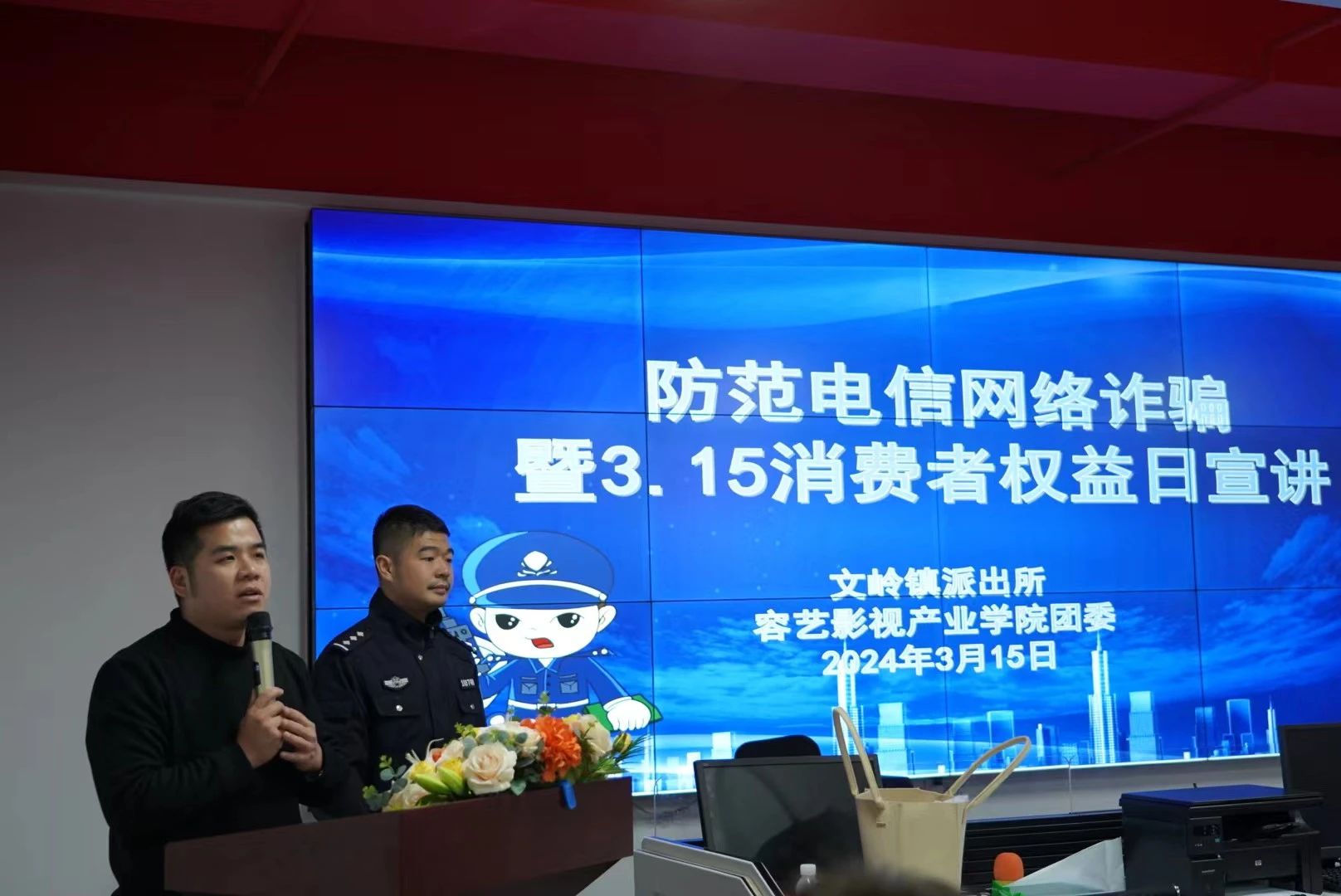 随着315消费者权益日的到来,各类诈骗案例层出不迭,为预防校园内金融诈骗犯罪案件的发生,切实增强学生防诈反骗的意识和能力,保障学生财产安全,3月15日15:00,在我院党总支书记林海老师主持下,特邀长乐区公安局文岭派出所民警谢警官在我院融媒体中心为同学们开展了一场“315消费者权益保护”暨防诈宣传专题讲座。