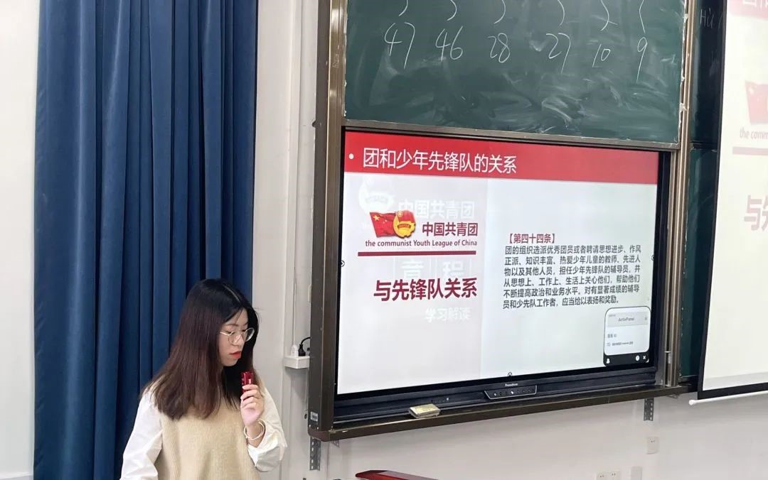 随后,张玉梅老师提出新时代共青团员应该具备的素养。作为新时代共青团员,应当有坚定的共产主义理想和信念,有优秀的品质和道德,有品学兼优的素质和扎实的文化基础,谨言慎行,文明有礼貌,在日常的一言一行中模范带头,展现大学生积极向上的一面。最后,她鼓励同学自觉学习中国共青团的发展历史和宝贵经验,扛起时代担当,做好新时代青年。