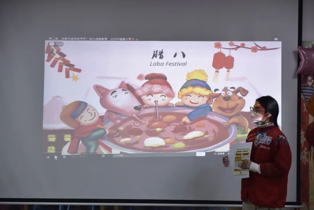 活动当日,志愿者聚焦中国传统节日腊八节,为孩子们播放腊八科普视频,讲解腊八节由来、传统习俗及文化内涵。孩子们认真观看视频、聆听讲解,现场活动氛围温馨有爱。