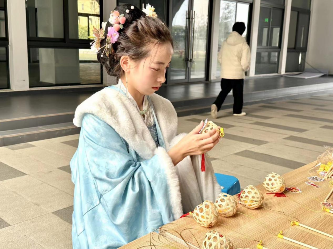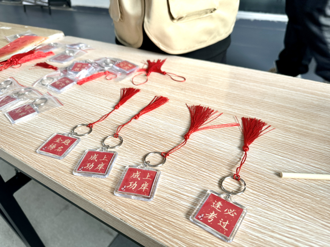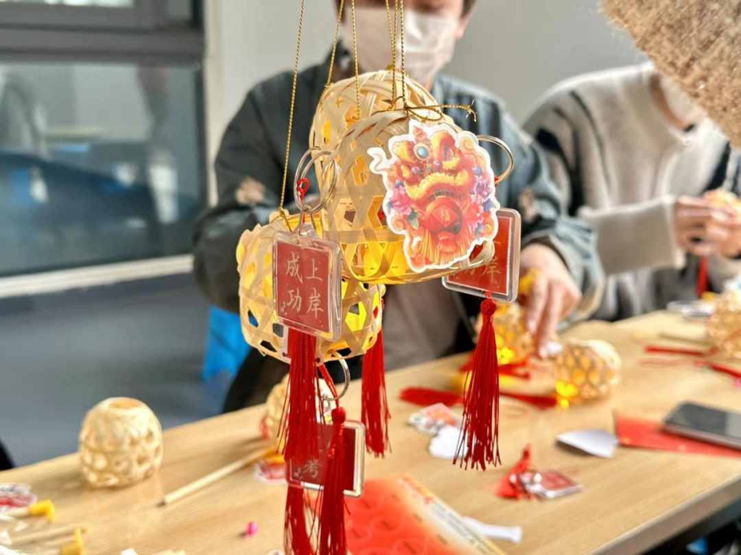 现场还准备着许多写有美好祝愿的红色挂件,同学们或坐或立,认真端详,屏息凝神地完成自己的手工挂件,为挂件系上麦穗状红色吊坠,成就感满满。同学们感受着手工劳动的快乐与学院大家庭般的温暖,现场洋溢着节日的喜庆。