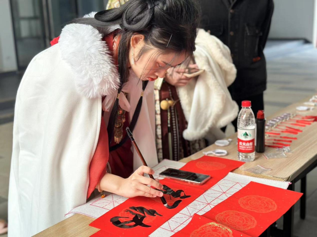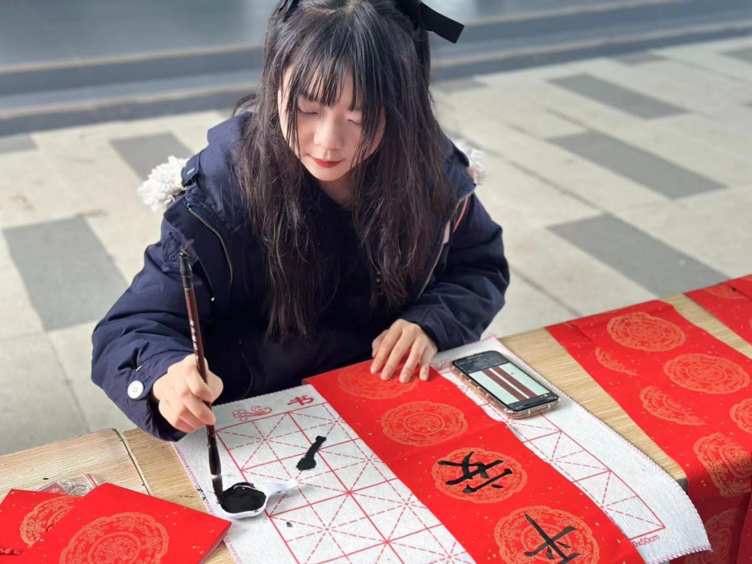 活动现场,红色宣纸、毛笔和砚台整齐摆放。一笔一墨,一横一竖,一撇一捺,一幅幅写满新年祝福的春联和福字在指尖流转下诞生了,写的是祝福,报的是节讯,暖的是人心。同学们于黑墨红纸间感受着笔墨丹青的独特魅力,续写新的一年美好祝愿。