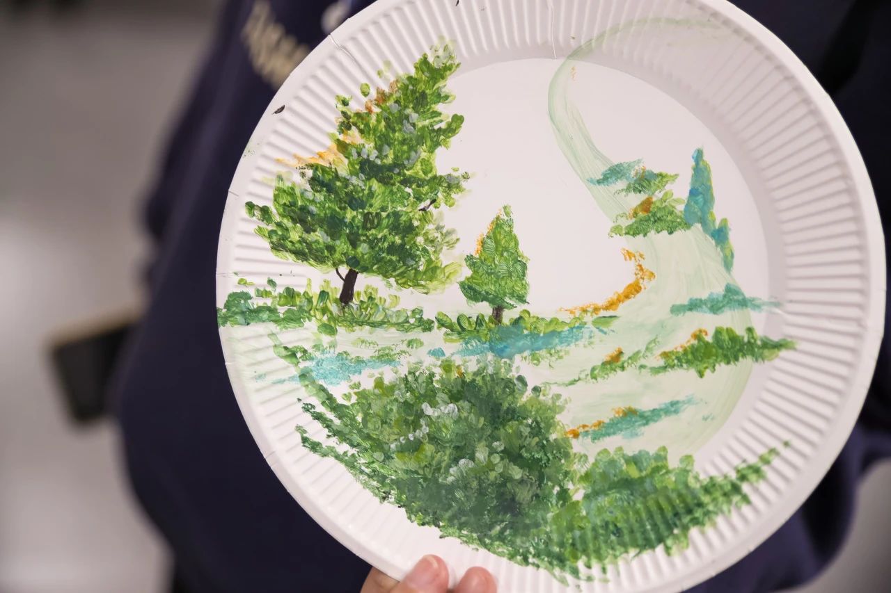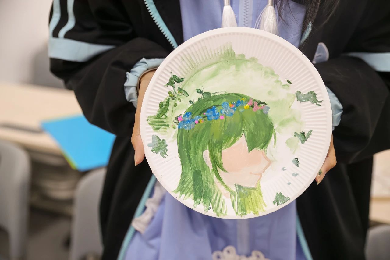 工作人员事先准备好了纸盘、颜料水桶、画笔,以便提供同学们进行更好的作画,同学们有的临场作画,有的查找资料进行临墓,大家拿起画笔在纸盘上绘下彩色的世界。在同学们的绘画下,一个不起眼的小纸盘,立刻就变得可爱生动充满了生命力