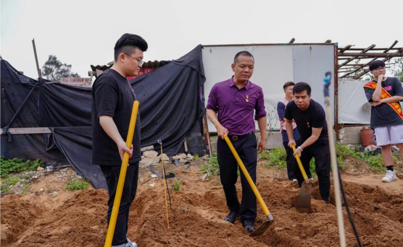 (图为福州软件职业技术学院校党委副书记林艺勇老师、学生工作部(处)长汪圳老师、容艺影视产业学院党总支书记林海老师正在锄地)