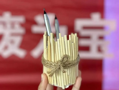 设计理念:利用一次性筷子和废弃塑料瓶进行重新设计和改造,再用胶布固定,这样就得到一个简易的笔筒,让其变废为宝。不仅能够降低污染、保护环境,还能够将物品转化为艺术品,从而创造出物品新的功能和价值。