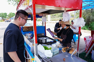 (图为学生志愿者在校外对周边的商贩进行科普)
