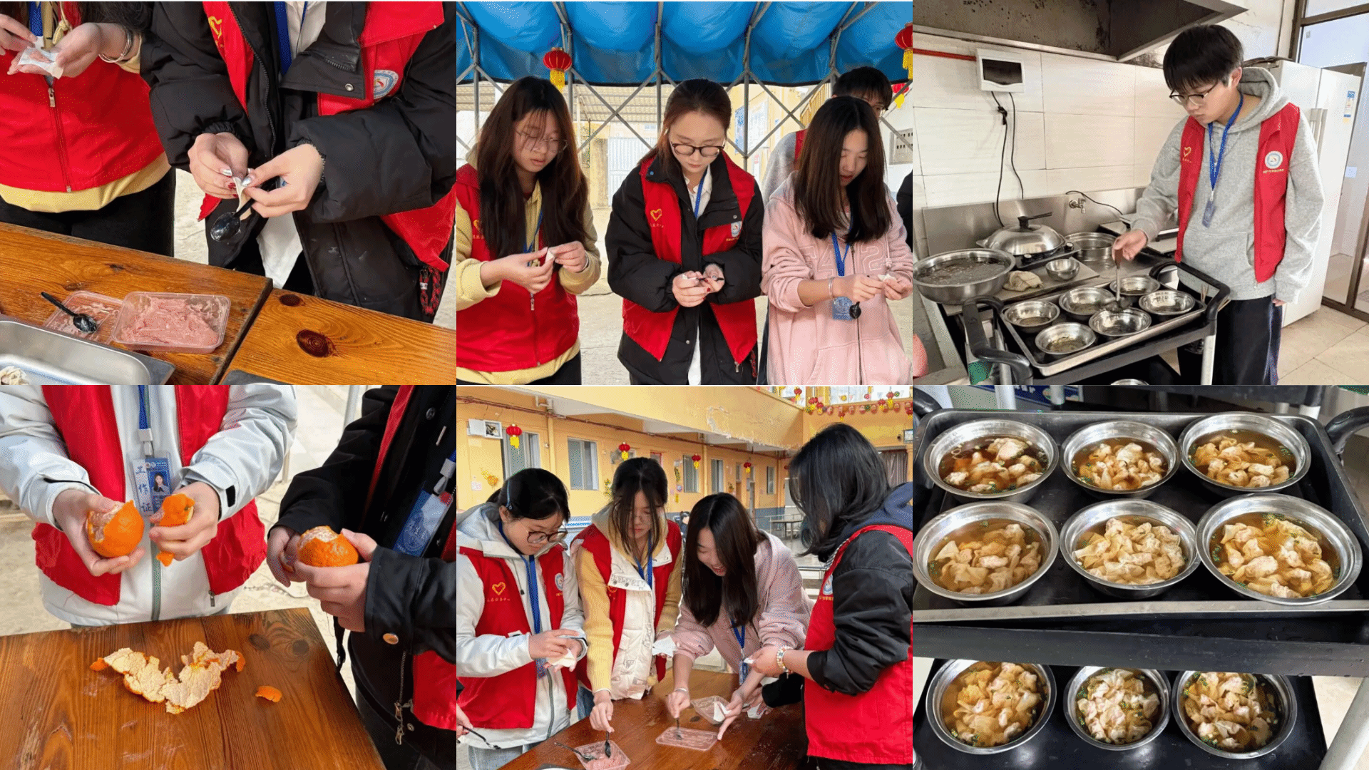 在充满烟火气的制作台前,志愿者们细心处理食材、和老人们一起包馄饨、剥橘子、分馒头,严格遵循老人口味与饮食禁忌,用心烹制一碗碗热气腾腾、清淡易消化的热馄饨面,让香气弥漫在敬老院的每个角落。