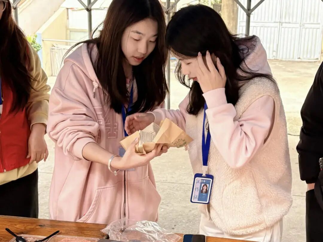 志愿者引导想参与的奶奶一同包制馄饨