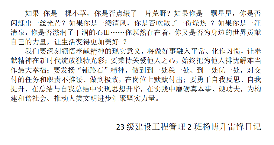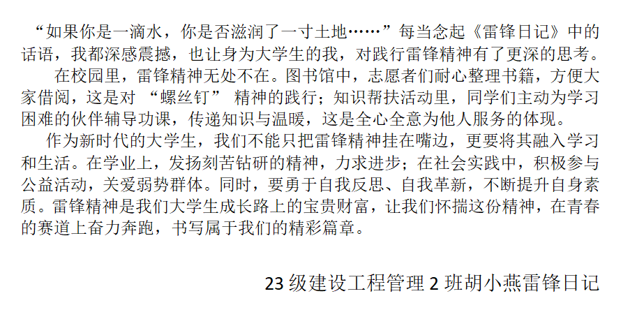 最后,团支书表示作为新时代青年要学习雷锋同志热爱党、热爱祖国、热爱社会主义的崇高理想和坚定信念,树立正确的世界观、人生观、价值观。同时还要学习雷锋同志服务人民、助人为乐的奉献精神,积极参与志愿服务,帮助他人,快乐自己。