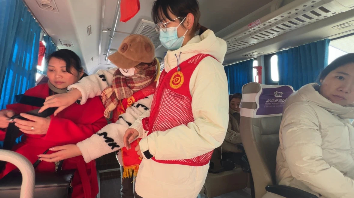看到有旅客提着大件行李艰难行走,志愿者主动上前帮忙,在旅客们有序上车后,志愿者们上前提醒帮忙系好安全带。