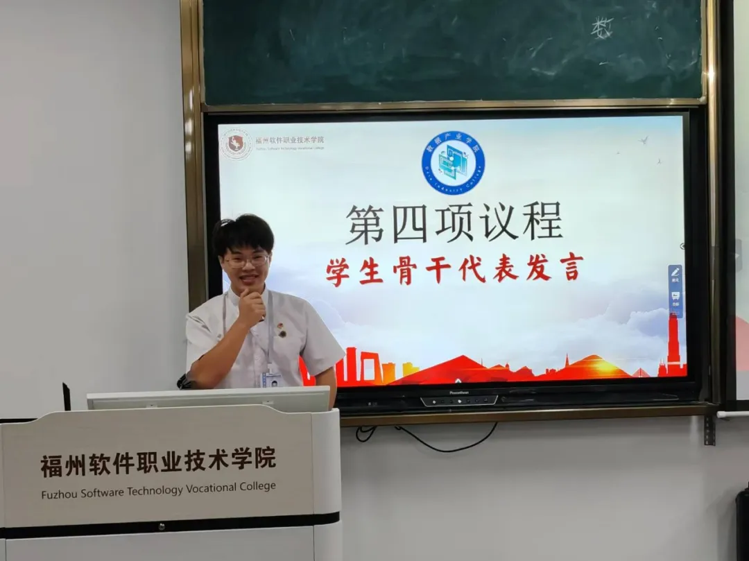 大会第四项议程,学生骨干代表许朝伟同学总结了过去一年中团学组织在自身建设方面的成就,也对团学组织接下来的工作进行了美好展望。数据产业学院学生骨干将会带着满腔的热忱出发,一步步、一点点地将团学组织变得更好。