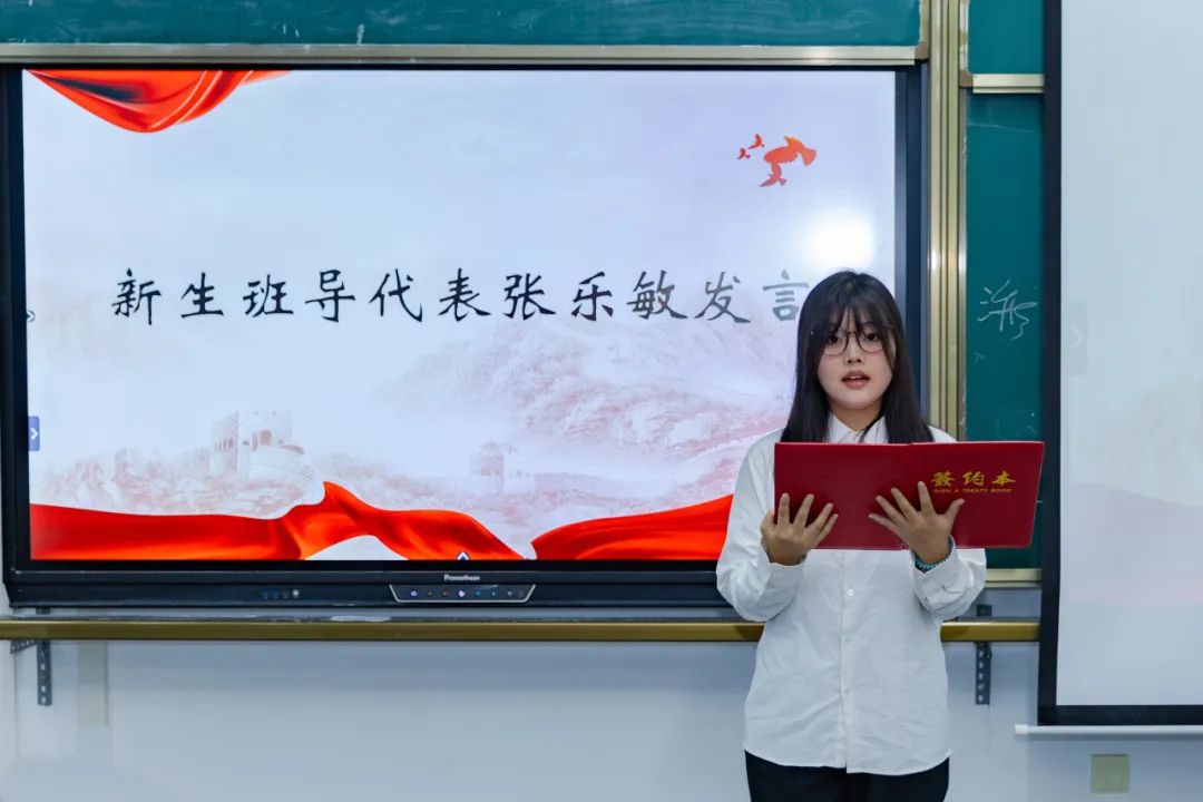 新生班导代表张乐敏同学感谢了学院给她提供了锻炼自我的机会和对她工作的认可。她分享了自己工作经验和成长收获,同时她希望在往后的工作中大家也能继续团结协作收获成长、成为师生交流的桥梁。最后,她再次感谢了老师与同学们对班导们的关心和信任。