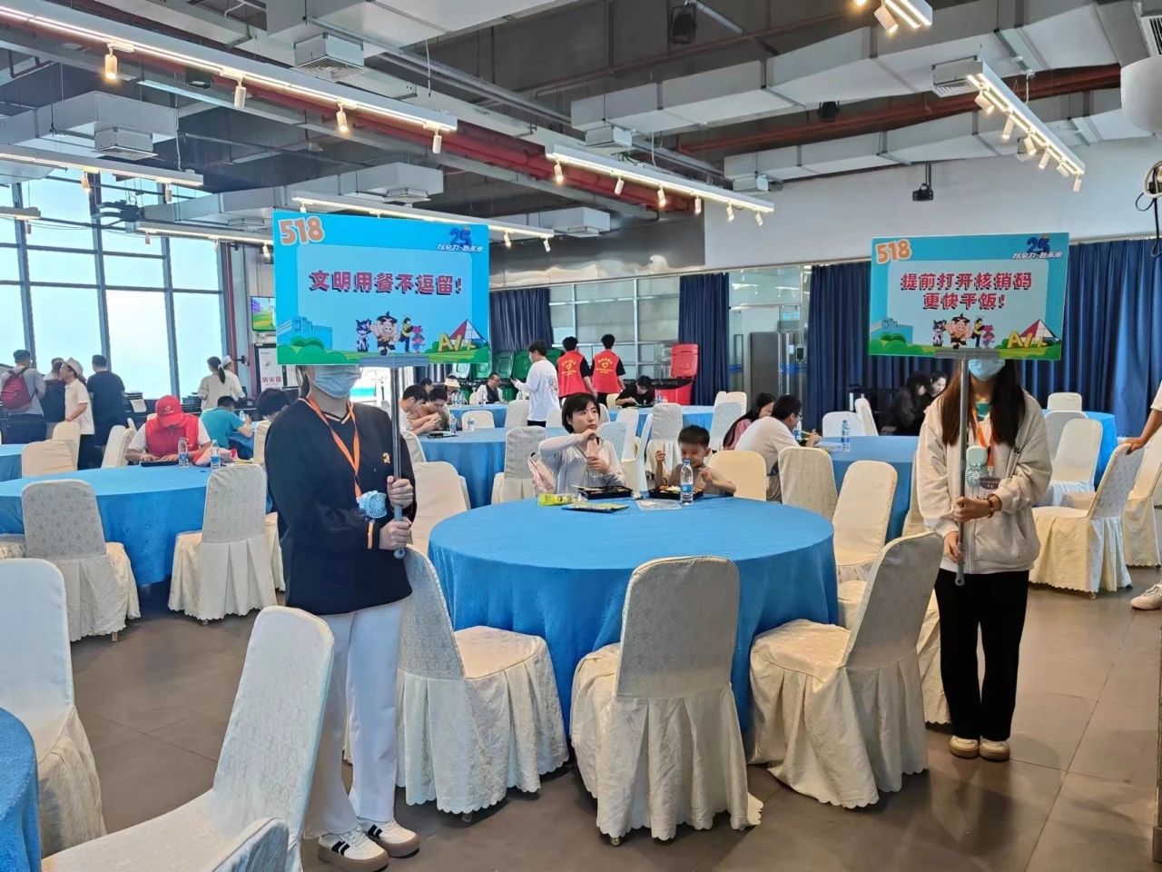 志愿者们在餐厅内举牌示意用餐人员文明用餐