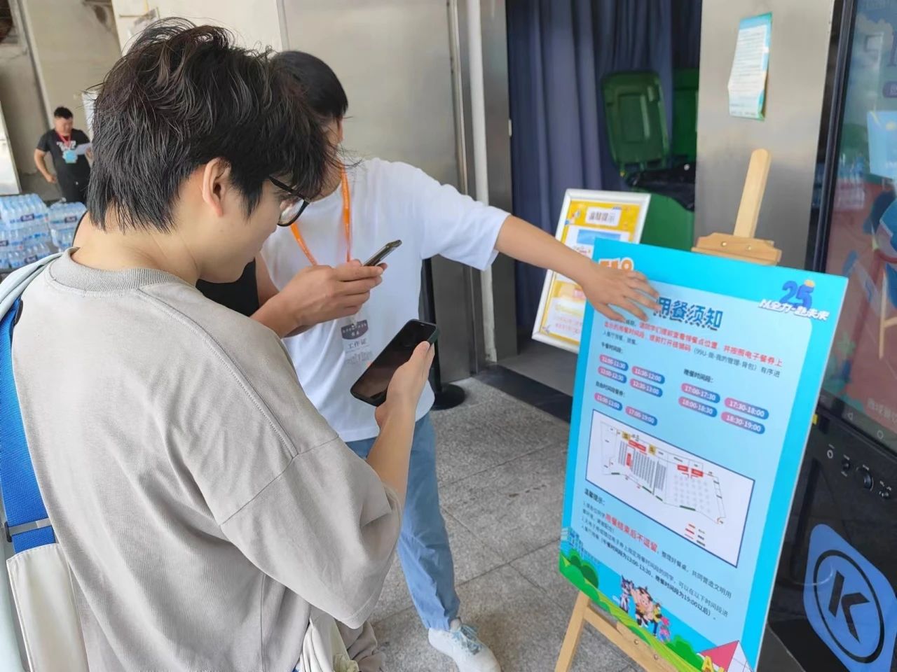 活动期间,身着志愿者服务帽与工作牌的志愿者们在餐厅各个门口核销与审核用餐人员的核销券,提醒用餐人员于正确时间段进入餐厅用餐,对前来就餐的人员进行文明引导,避免在餐厅入口拥挤滞留。
