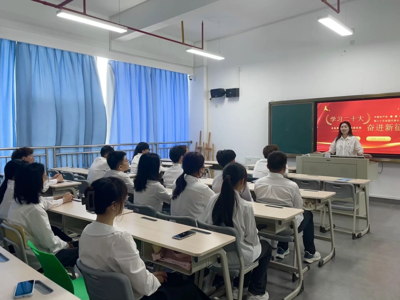 在授课过程中,寇文静老师结合具体的案例阐述党的二十大精神。她分享了我国在科技创新、经济发展、社会进步、环境保护等方面的显著成就,让同学们深刻感受到新时代十年伟大变革的实质和内涵。向同学们展望中华民族伟大复兴的宏伟蓝图,激发同学们奋进新征程、建功新时代的热情,坚定永远听党话、跟党走的信心和决心。