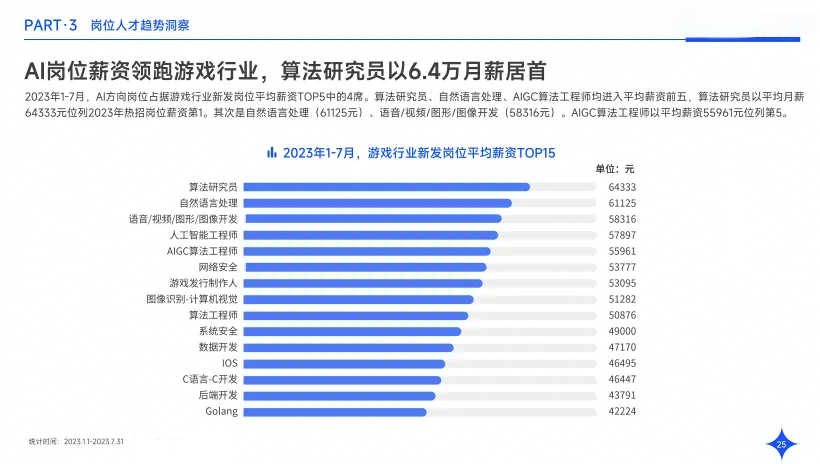 游戏行业人才需求正迎来多样化和专业化的发展趋势。在技术人才特别紧缺的领域,包括语音、视频、图形和图像开发,以及游戏策划、U3D游戏主程工程师、原画师和3D设计师等职位的需求一直居高不下。随着AI技术的不断进步,AI相关岗位,如算法研究员、自然语言处理工程师和AIGC算法工程师等,不仅需求增长,其薪资水平也显示出行业对高端技术人才的极大渴求。