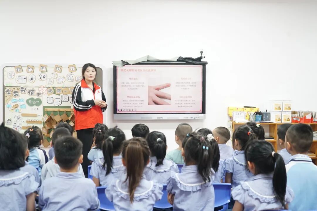 课程开场,志愿者引入趣味动画视频,先教擦伤应急处理流程,再通过情景模拟让小朋友们练技巧,随后又用动画和演练讲“冲脱泡盖送”急救法,帮小朋友们掌握技能应对意外。