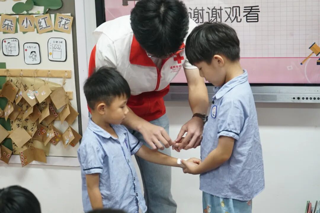 课堂上,志愿者先细致传授简单包扎方法,指导小朋友们洗手后冲洗伤口、按压止血,再用纱布或创可贴固定;随后讲解异物卡喉的应对办法,着重强调需及时求救,让小朋友们在实操学习中掌握实用急救技能。