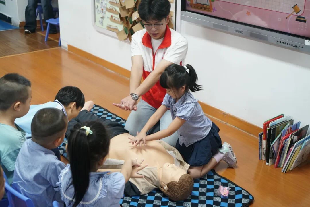 随后,志愿者详细讲解胸外按压与人工呼吸要领,手把手指导小朋友们实操练习,助力小朋友们切实掌握实用急救技能、增强防护意识。接下来,校红十字会将不断丰富安全普及活动形式,让安全理念深入人心。