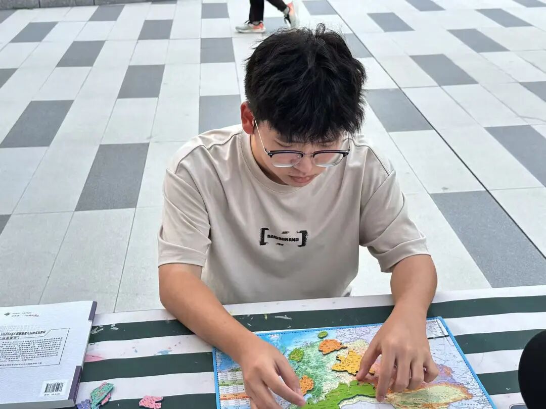 在“山河拼图方寸绘九州”活动中,参与者仿若化身祖国山河的勾勒者。于拼图区域,专注拼接大型中国地图拼图,每一次拼合拼图块并回答问题,皆似在亲手描绘祖国的壮丽版图。往昔山河岁月,疆域关乎家国,不容模糊。让大家在拼图过程中感受祖国山河的辽阔与壮美,增强国土意识,在新时代以赤诚之心守护九州。