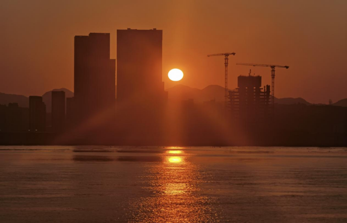 依稀记得这张照片拍摄于2021年,那是中国共产党建党100周年之际,我从船政博物馆出来走到江边看到此情此景,便伸手拍下。红日马上就要隐匿在山峰下,而此刻它就在那挂着,红色的光辉照耀着江面,是那么的璀璨。以日为界,两边的建设却截然不同,一边是两栋大楼,一边是两架塔吊,在各自的位置上屹立着,虽然在时间上,它们有明显的差距,但是在这片土地上,在伟大的工农人民建设者的建设下,我相信我会在江面上看到那新的大楼的倒影。时间长河的流转,太阳的升起,会带来新的光辉。