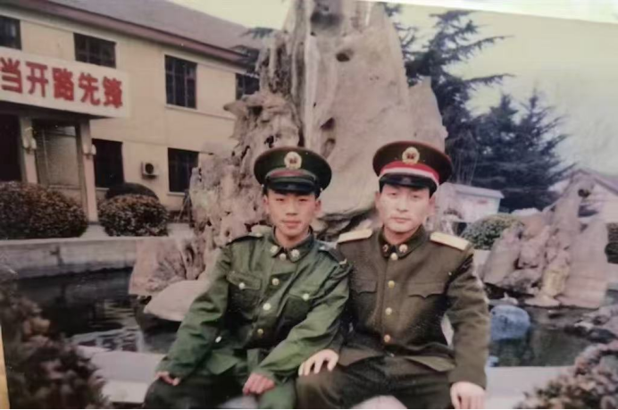 这张照片定格了二十年多前我叔叔在军营里的一段珍贵记忆。画面中,他和他曾经的班长身着具有时代特征的军装,背景建筑上“争做时代闯将,勇当开路先锋”的红色标语铿锵有力,彰显着部队的使命担当。橄榄绿与深棕交织的一身军装,承载着军人的荣耀与责任。军装的制式、帽徽的细节,都烙印着二十年多前军队的风貌,每一处缝线都仿佛在诉说着那段热血岁月里的训练、坚守与战友情深。身后的假山、池塘与建筑,是他们曾经挥洒青春的地方。如今,我的叔叔也已经四十来岁,二十载光阴流转,军装也早已褪色,容颜也逐渐苍老,但照片里曾经的军装荣光与军人底色,始终是他们生命中最鲜明的印记,也成为一代人对军旅岁月的怀念。