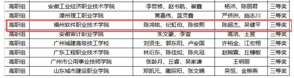 我校建筑智能化工程技术专业陈鸿铭、纪虹伯、陈俊熙三位学子在指导教师吴健平、陈超杰的悉心指导下,凭借过硬的专业技能和创新实践能力,从全国各省市参赛队伍中脱颖而出,最终斩获全国总决赛三等奖。