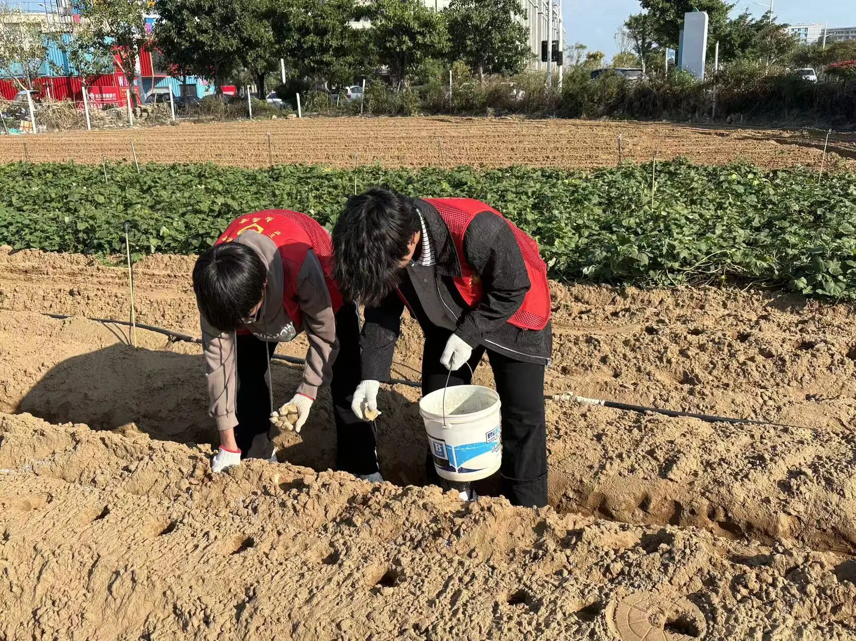 在掌握种植要领后,志愿者们分工协作开展土豆种植工作。大家先将经过挑选的种薯按芽眼朝向整齐摆放在种植沟内,确保每个种薯间距均匀、芽眼朝上;随后用铁锹轻轻回填土壤,将种薯完全覆盖,并用脚轻轻压实表层土壤,防止浇水后土壤塌陷;完成整个种植流程,期待种薯在精心照料下顺利发芽生长。